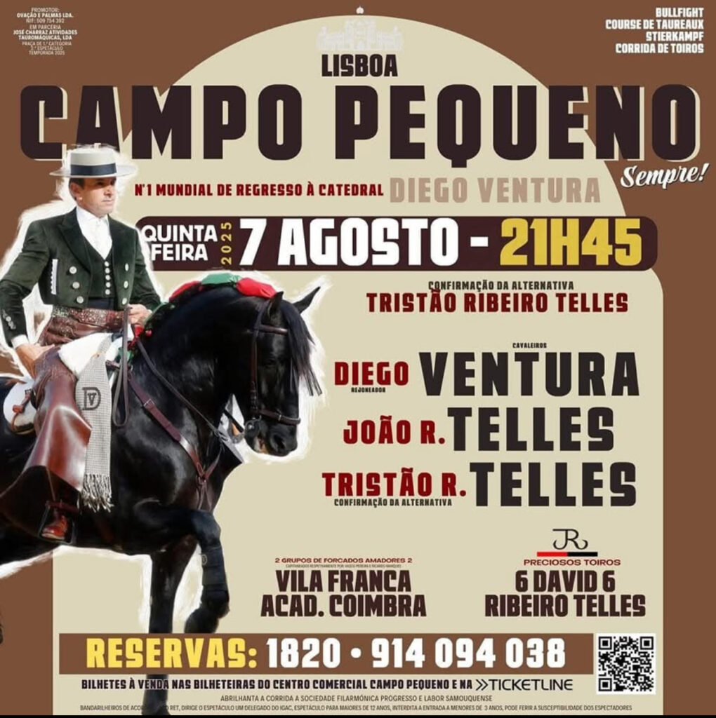 É já esta 5ª feira, na capital do toureio a cavalo do mundo, que Diego Ventura, João Telles Jr. e Tristão Ribeiro Telles, os grupos de forcados Amadores de Vila Franca e Académicos de Coimbra, vêm ao campo pequeno, lidar e pegar 6 toiros da Ganadaria de David Ribeiro Telles.