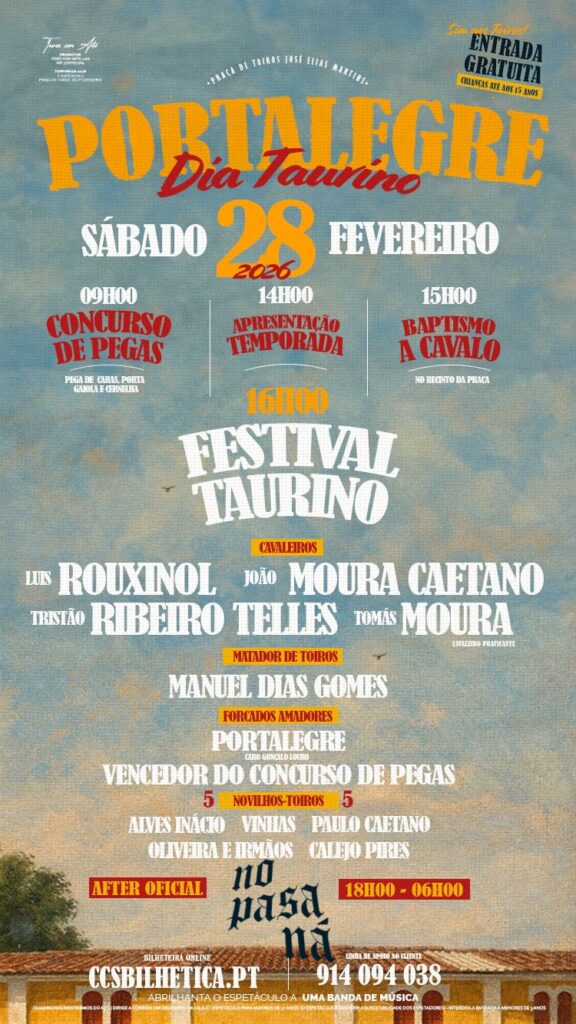 O programa tem início às 09h00, com o Concurso de Pegas. Pelas 14h00, terá lugar a Apresentação da Temporada Taurina 2026 de Portalegre, seguindo-se, às 15h00, o Batismo a Cavalo, destinado às crianças e jovens, proporcionando um primeiro contacto com o mundo equestre. O Festival Taurino, ponto alto da jornada, está marcado para as 16h00.